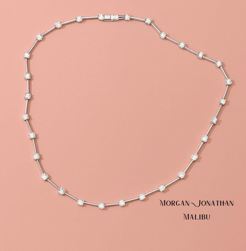 Each diamond is set in classic four-prong settings, gracefully punctuated & linked by sleek gold bars that create a stunning diamond line encircling the neck. Designed for versatility, it’s stunning layered or worn as a standalone statement.