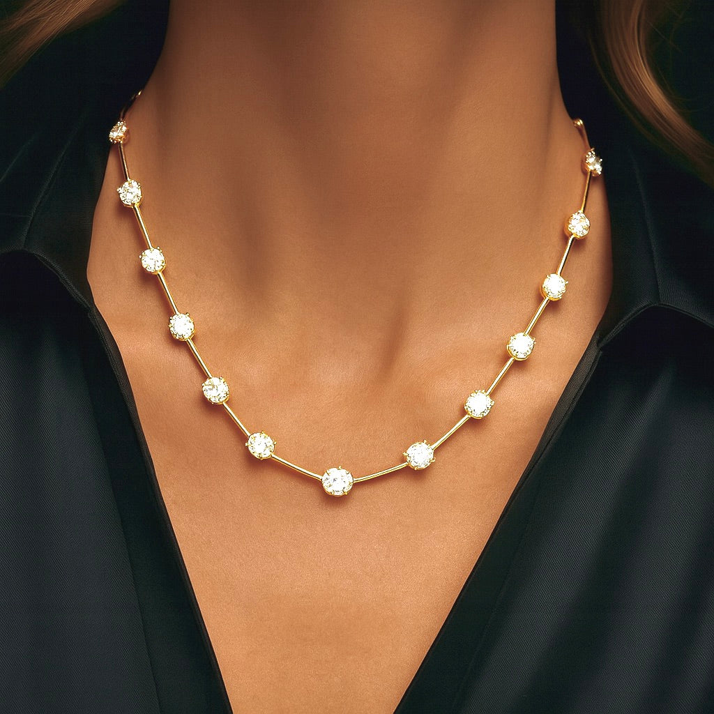 Each diamond is set in classic four-prong settings, gracefully punctuated & linked by sleek gold bars that create a stunning diamond line encircling the neck. Designed for versatility, it’s stunning layered or worn as a standalone statement.