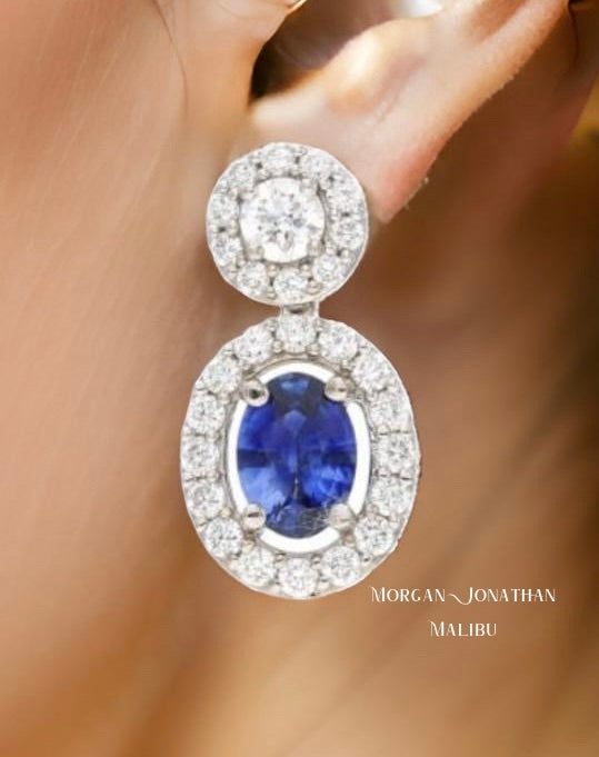 Diamond & Tanzanite Halo Design Dangle Earrings. 18Kt Gold. 6.00 Carats
