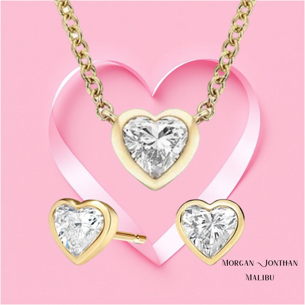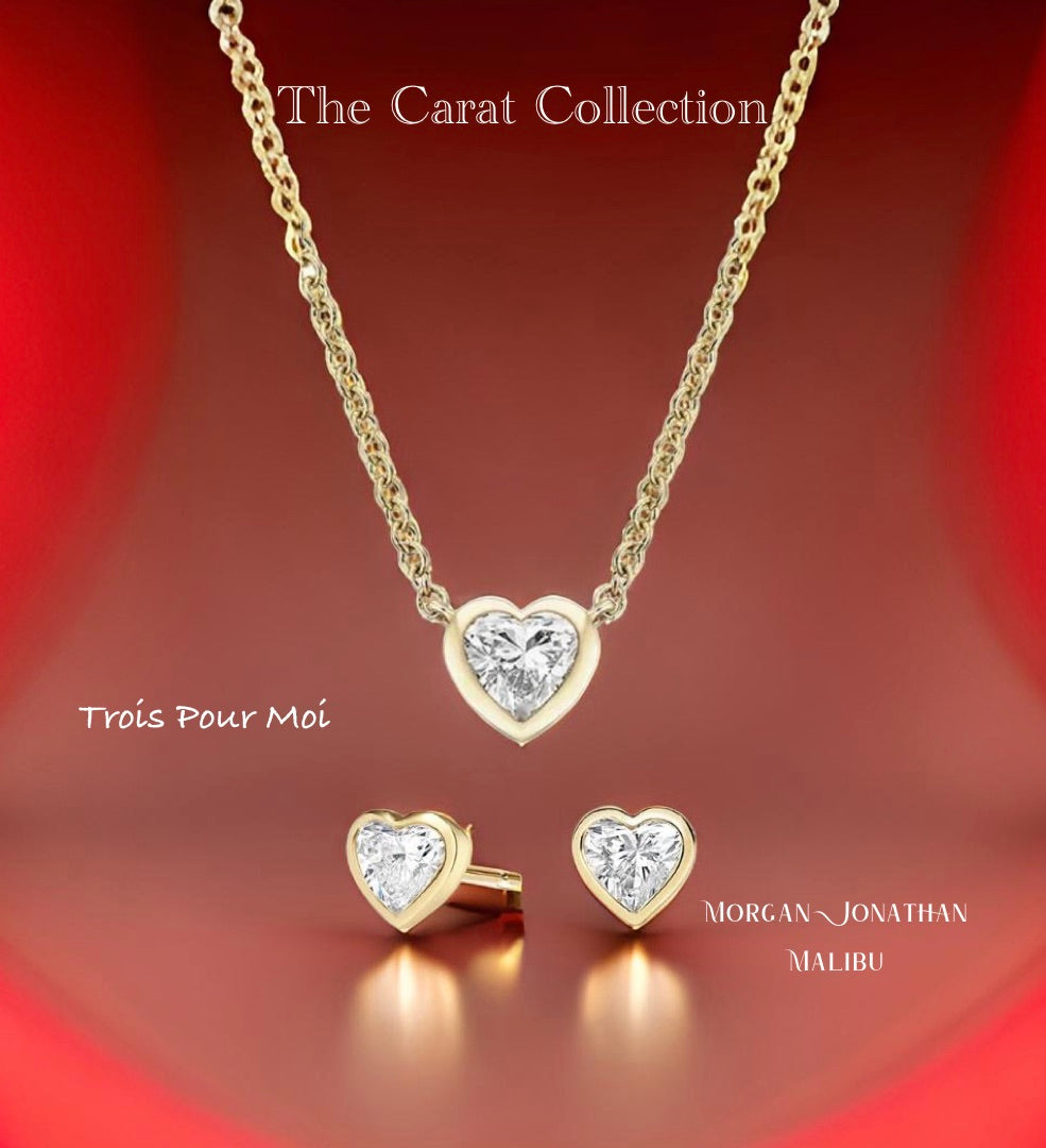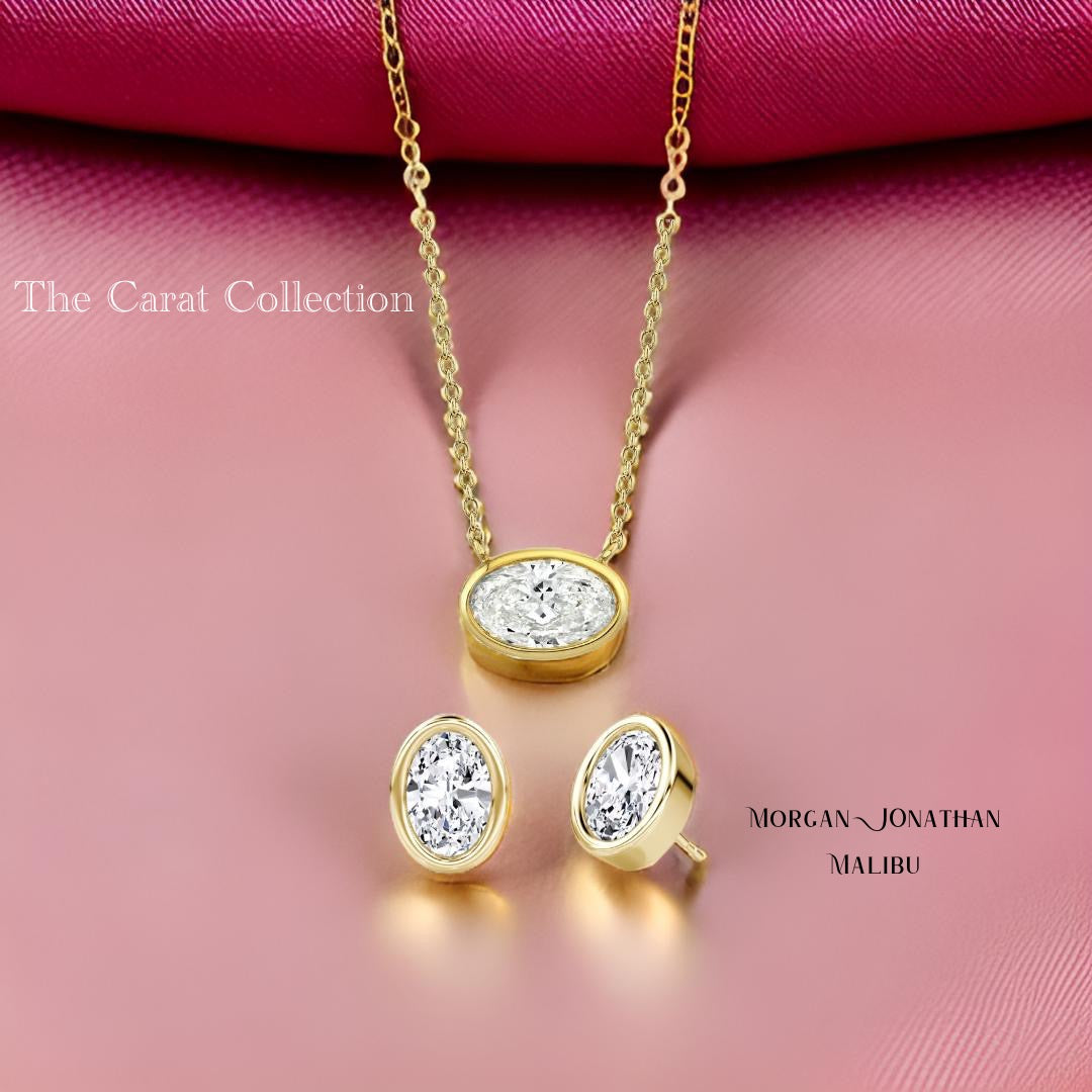 CARAT COLLECTION. BEZEL SET DIAMOND NECKLACE & EARRING TRIO. 14KT GOLD .75 CARAT, 1.00 CARAT, 1.50 CARAT, 2.00 CARAT, 3.00 CARAT