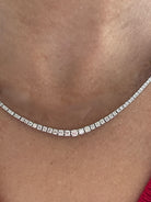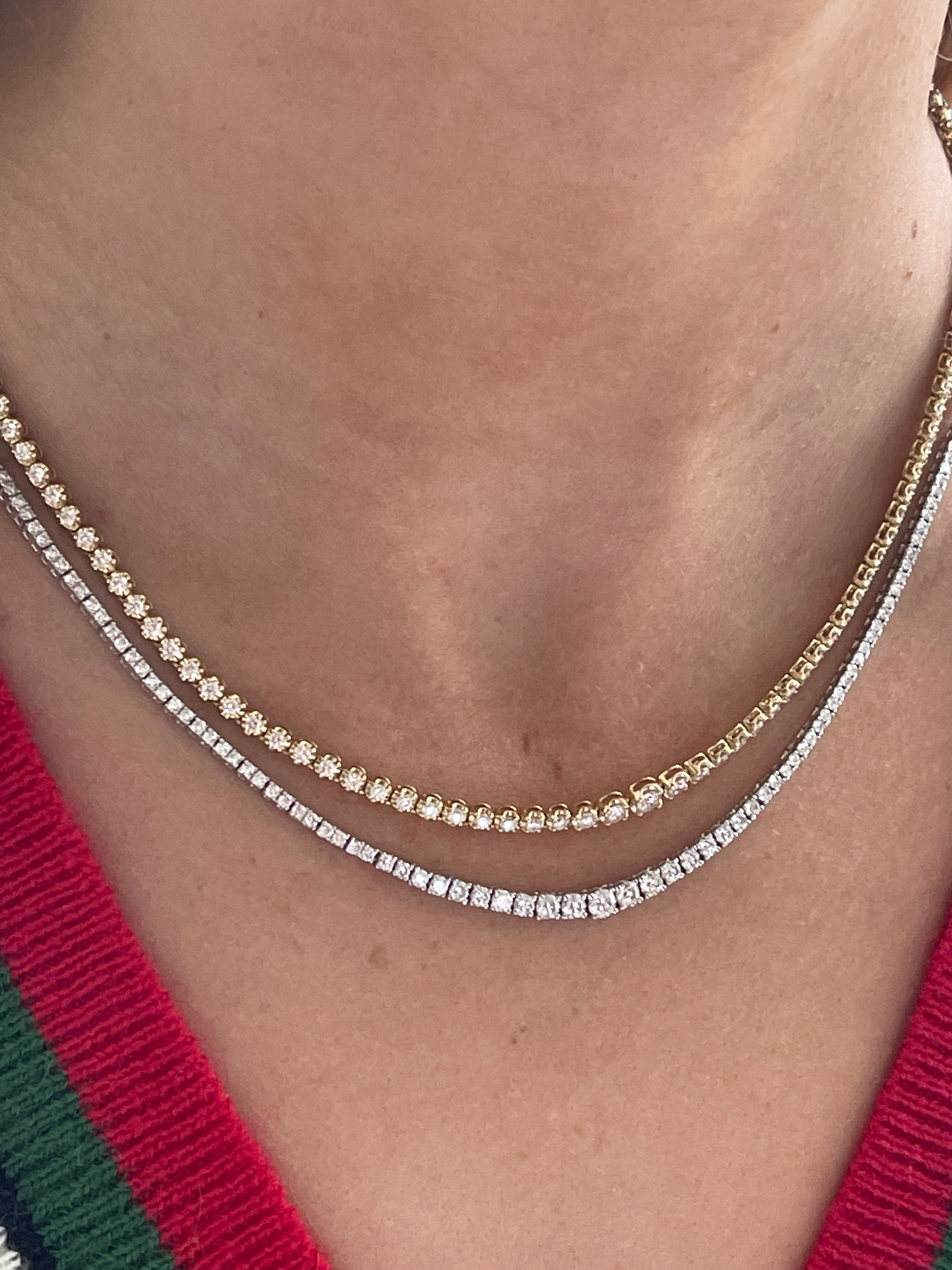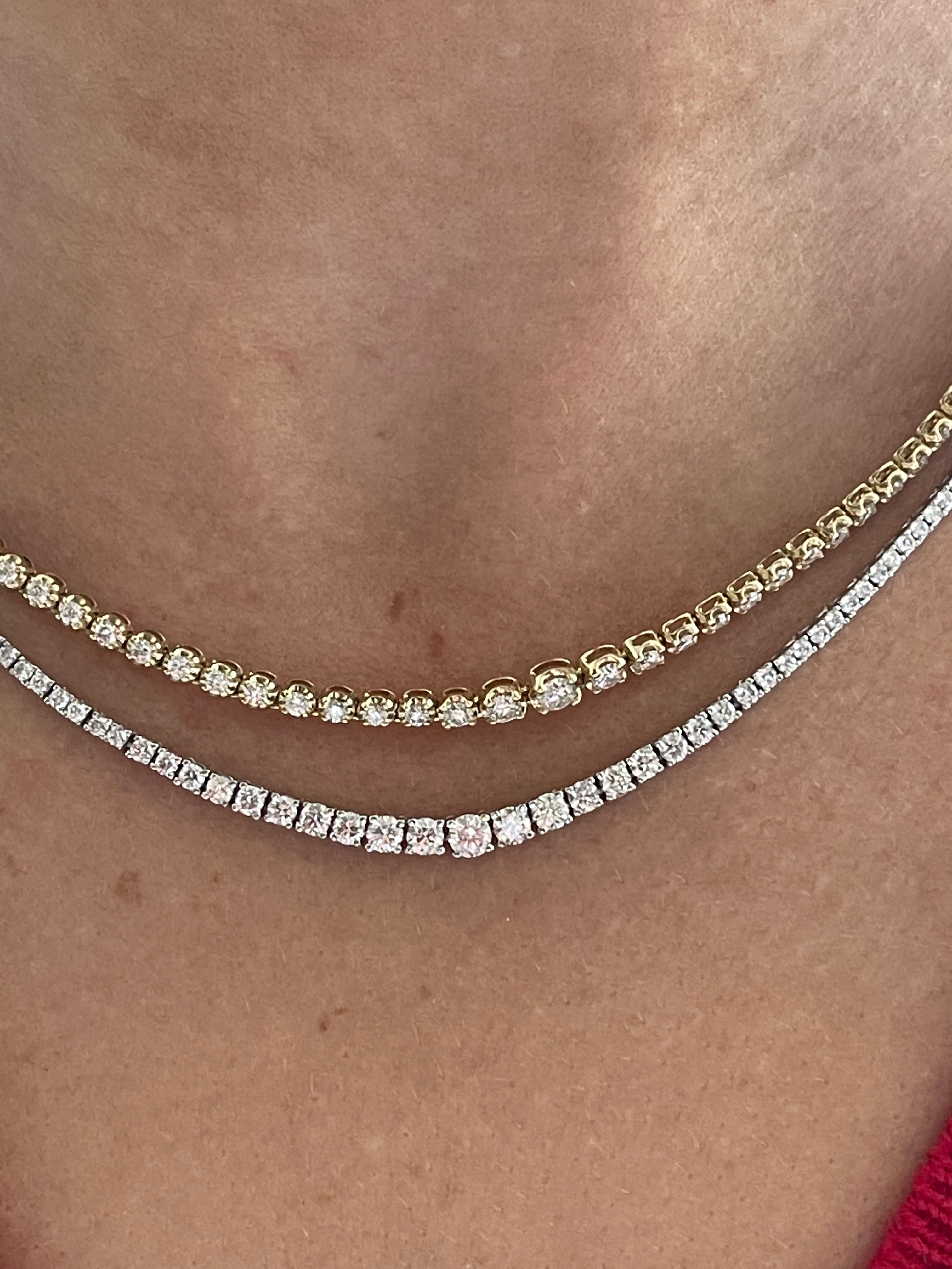 - OUR UNIQUE 4 PRONG GRADUATED DIAMOND DESIGN GRACEFULLY DRAPES AROUND THE NECK. SITS PERFECTLY WITH OTHER NECKLACES, PENDANTS OR CHAINS.