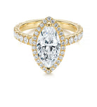 A Select 1.03 Carat Marquise-Cut Diamond, specifically chosen for its exceptional balance of shape and proportion to serve as the dazzling centerpiece of this custom-designed ring. Created specifically to highlight the diamond’s rare brilliance and sought-after silhouette, it is surrounded by a brilliant halo of expertly matched round diamonds of superior cut and quality that continue down the band to wrap elegantly around the finger adding another 1.50 carats of explosive brilliance.