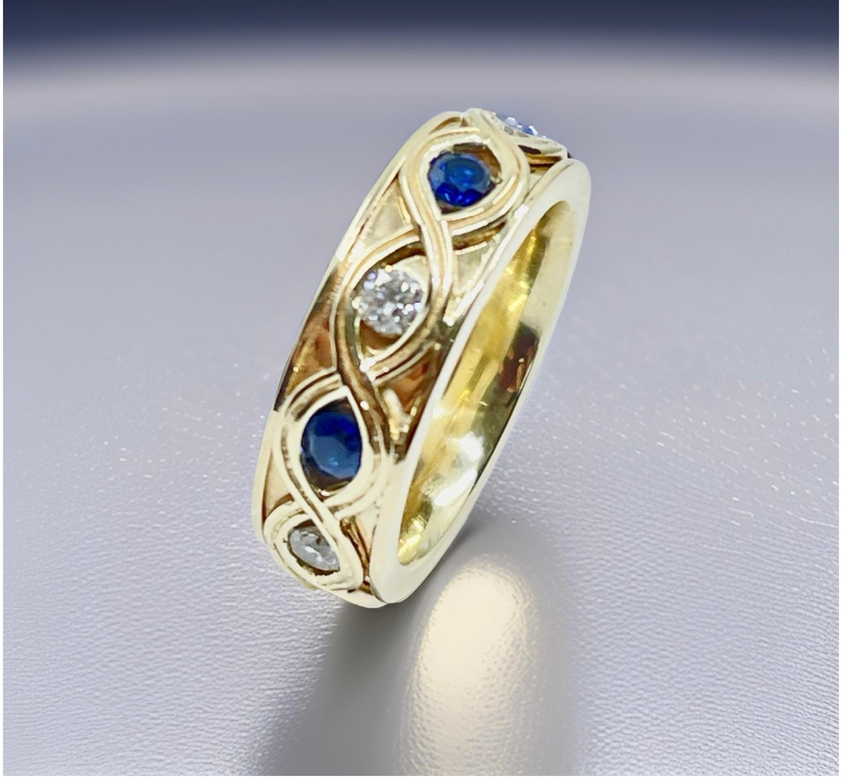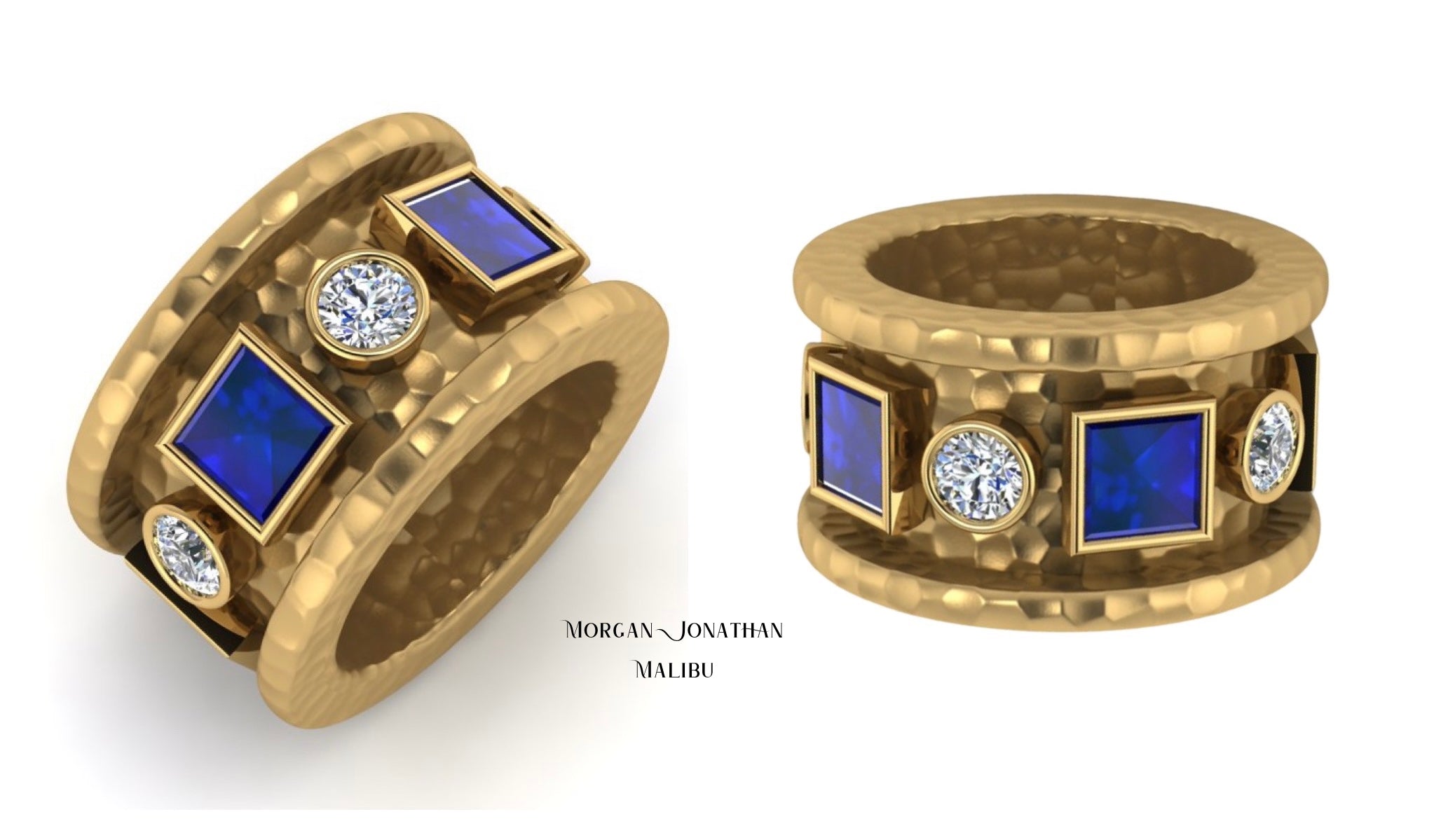 Handcrafted Artisan Hammered 18KT Gold Sapphire & Diamond Band