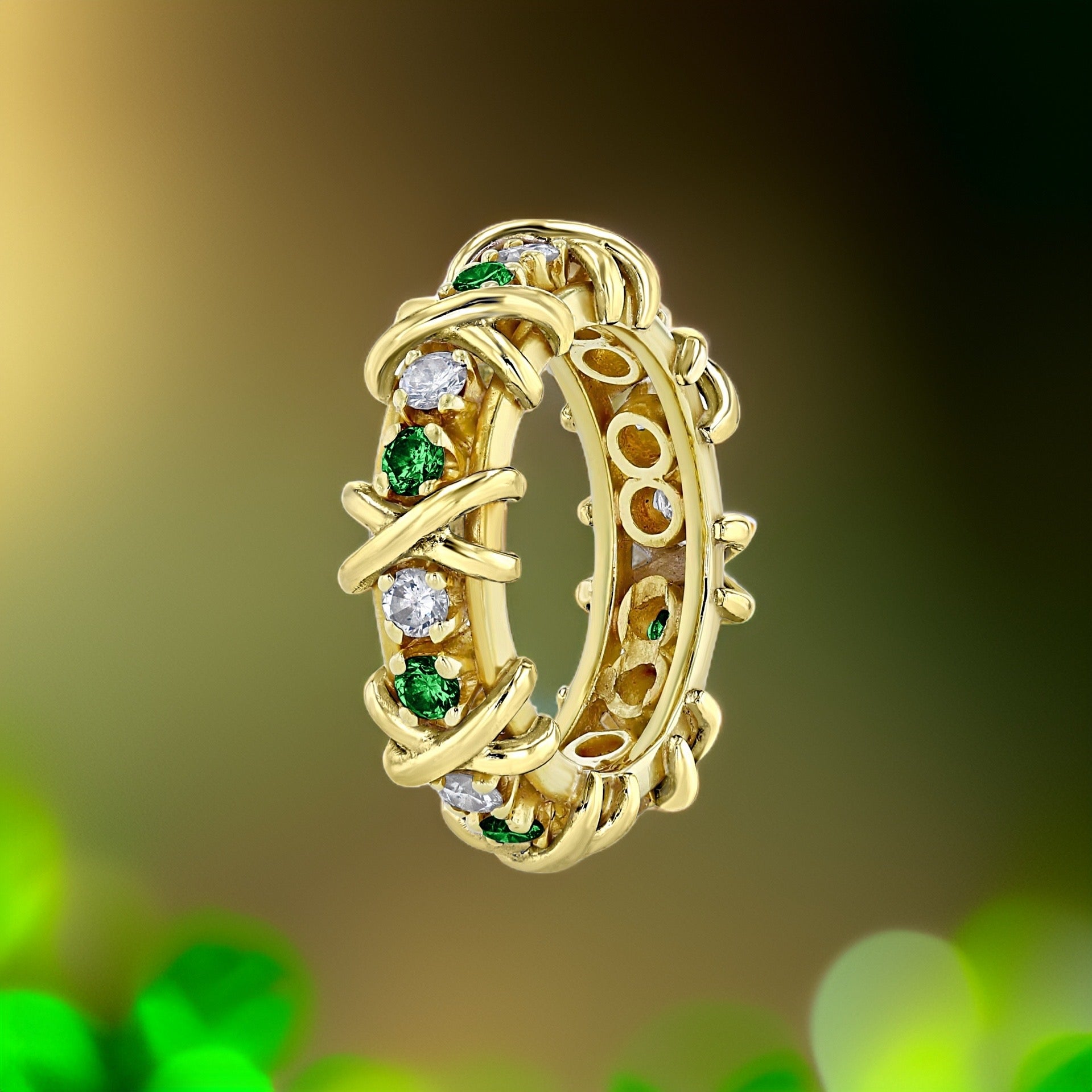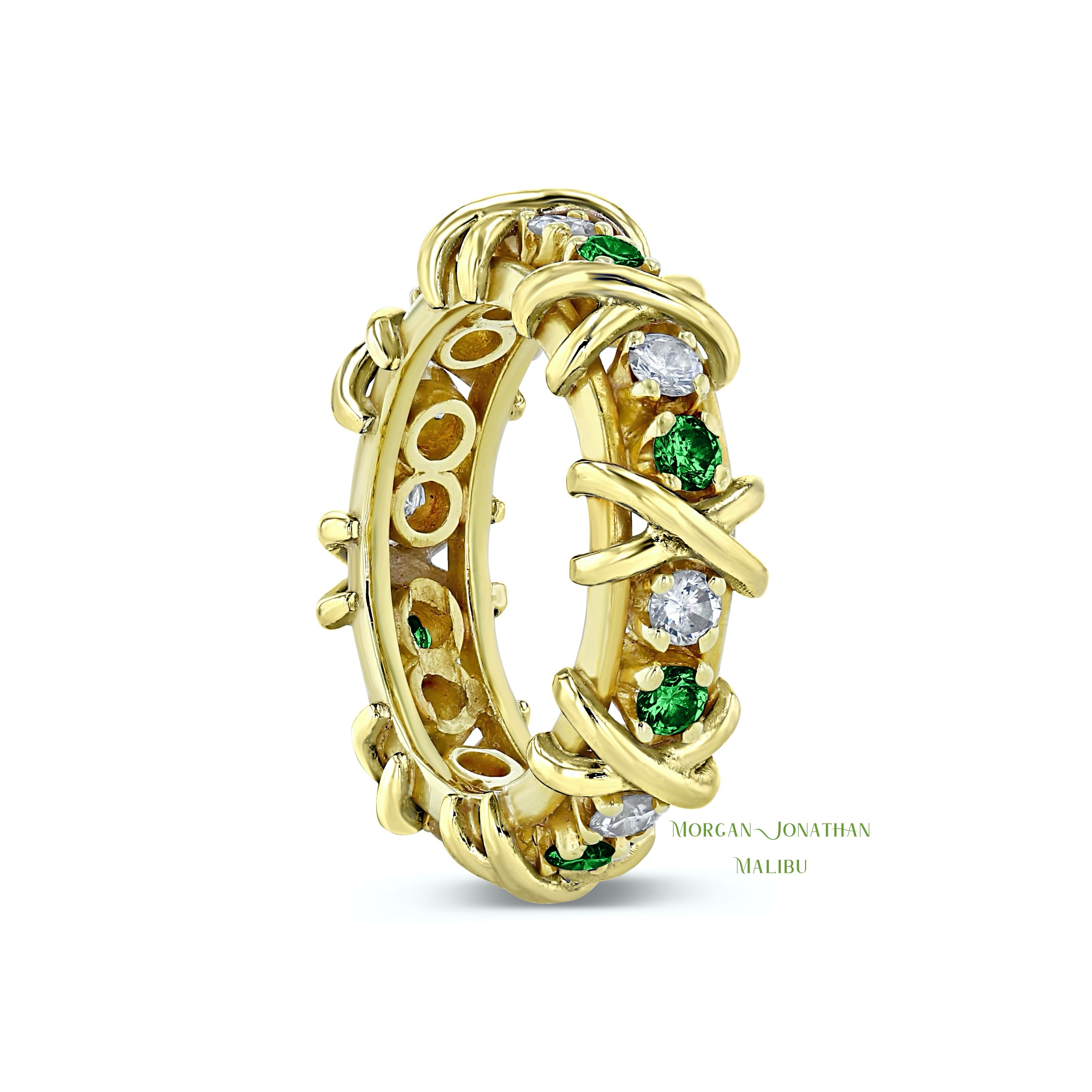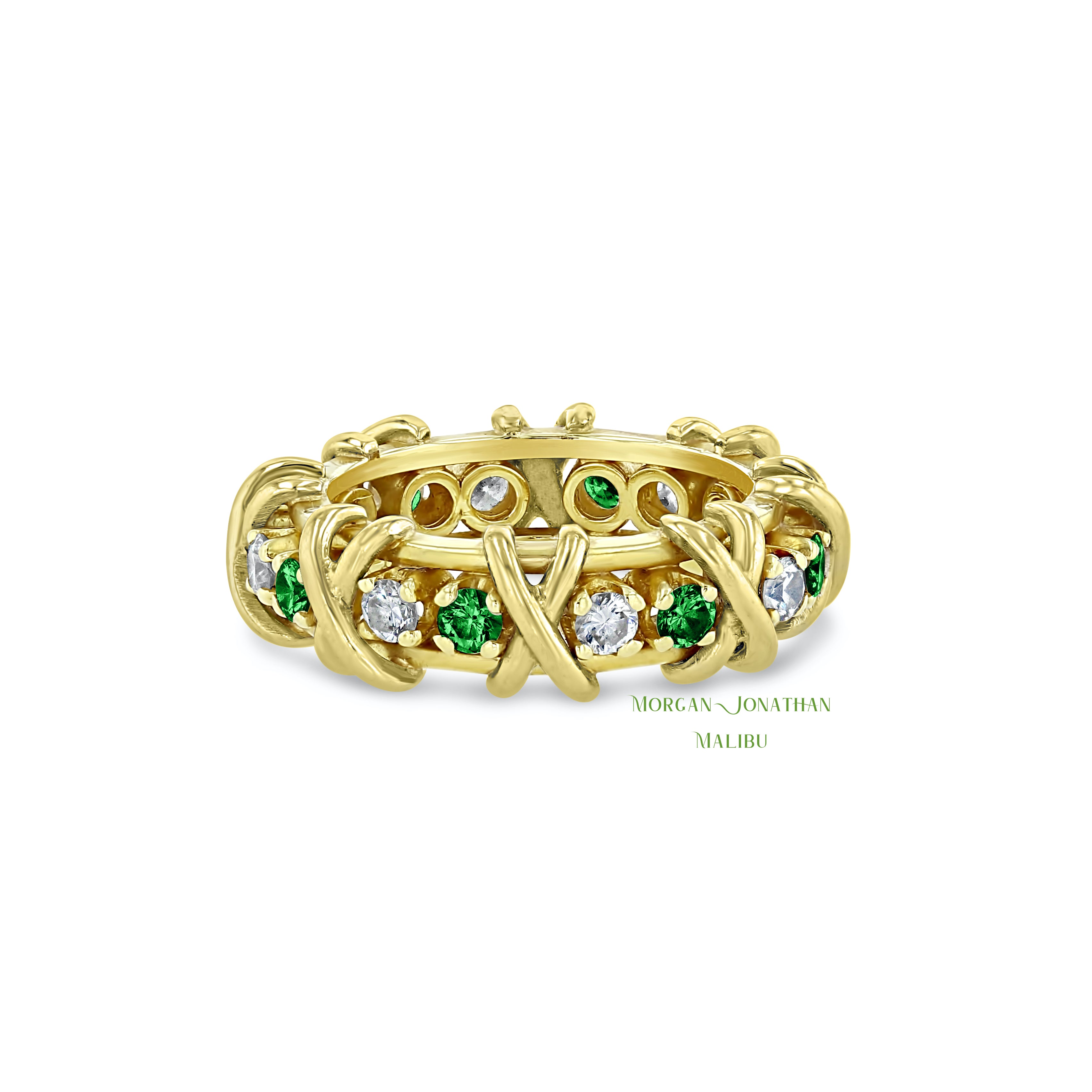 HUGS & KISSES DIAMOND & GREEN TSAVORITE X & 0 DESIGN ETERNITY BAND GOLD PLATINUM