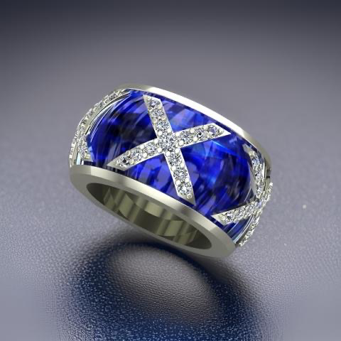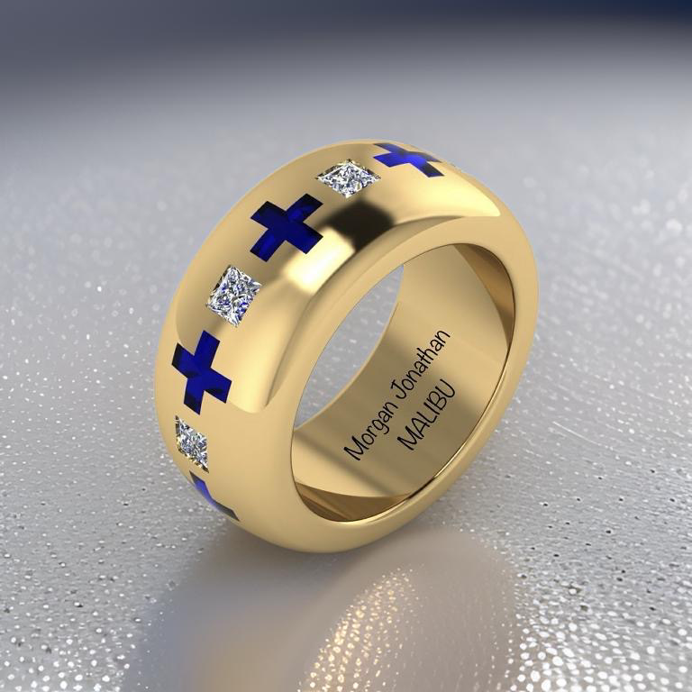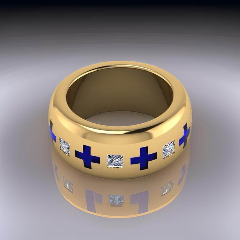 18KT GOLD CUSTOM WIDE DOME ENAMEL CROSS PRINCESS DIAMOND WEDDING BAND