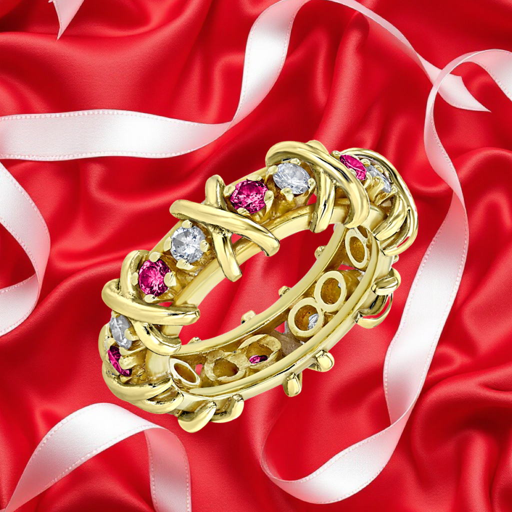 HUGS & KISSES "DIAMOND & RUBIES" X & O DESIGN ETERNITY BAND 18KT GOLD PLATINUM